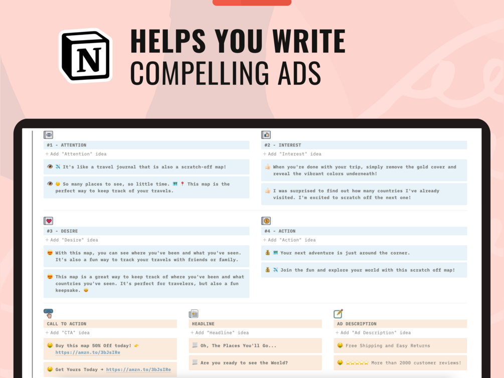 AIDA Facebook Ads Notion Template V2 - Ultimate All-In-One Ad Planner - Build and write converting ads with Notion - Duplicate and start using!